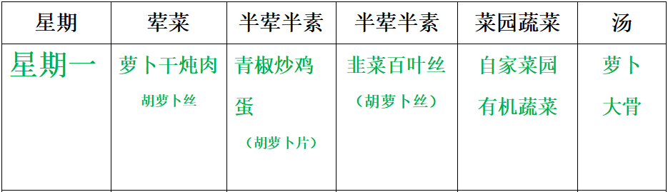 星期一晚餐: 萝卜干炖肉胡萝卜丝    青椒炒鸡蛋(胡萝卜片)     韭菜百叶丝(胡萝卜丝)    自家菜园有机蔬菜    萝卜大骨