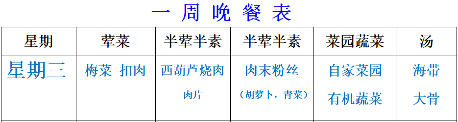 星期三:梅菜扣肉 西葫芦烧肉肉片 肉末粉丝 (胡萝卜,青菜) 自家菜园有机蔬菜 海带大骨